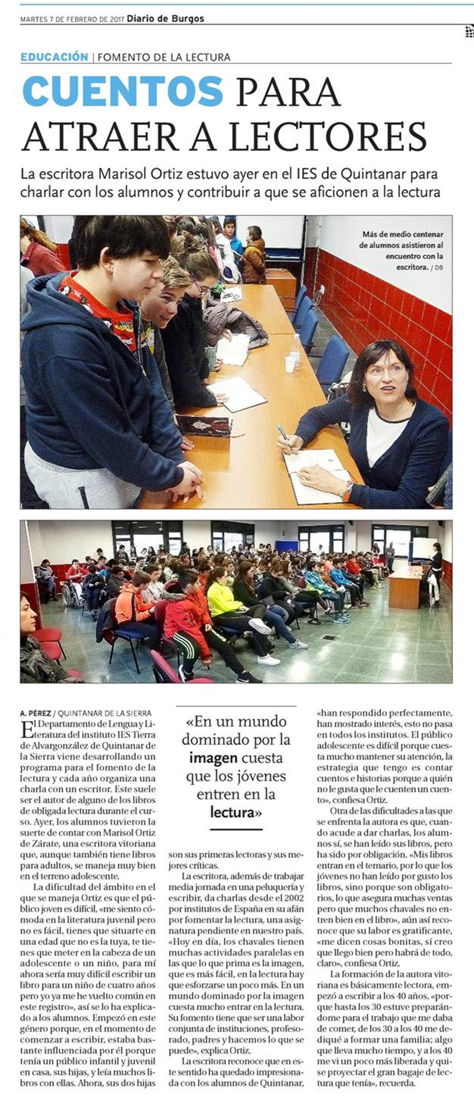 Ayer visito nuestra ciudad la escritora Marisol Ortiz de Zárate, más concretamente el IES «Mar de Aragón», al que llego puntalmente a las 11:30 horas, donde ha departido por más de una hora con el profesorado y alumnos de los grupos de 1º de la ESO, en el Salón de Actos.